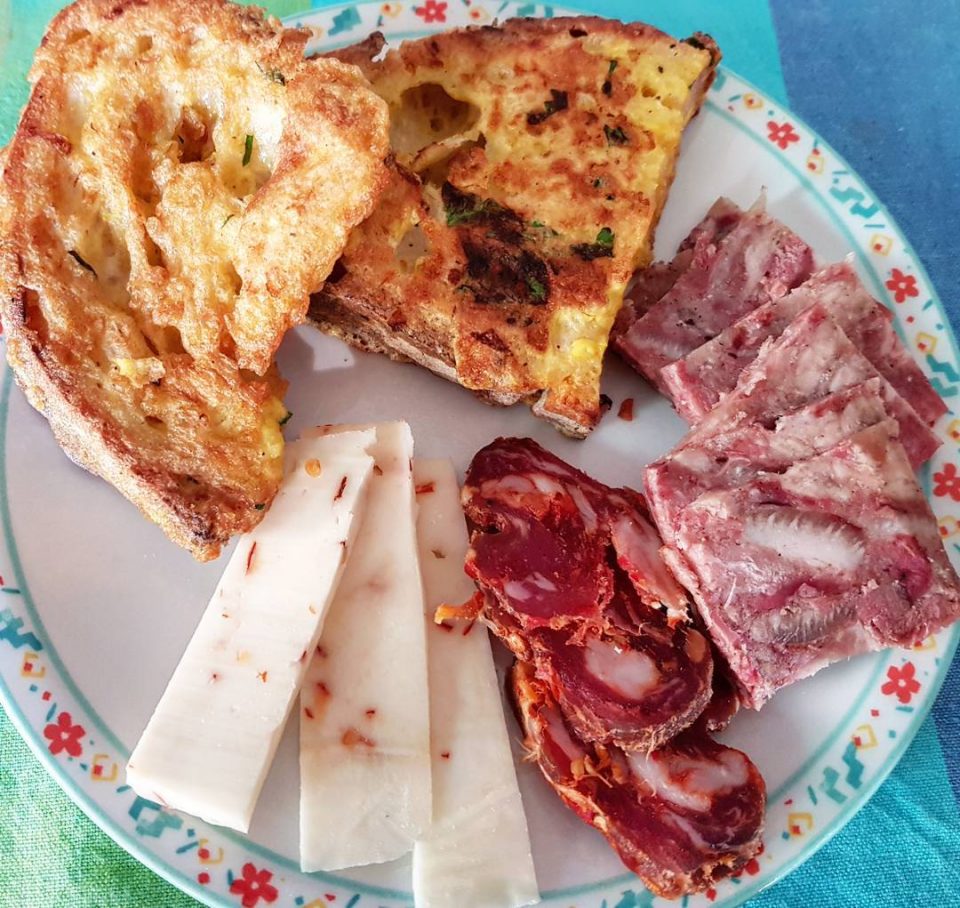 Pane all’uovo accompagnato da coppa di maiale, salame e formaggio al peperoncino